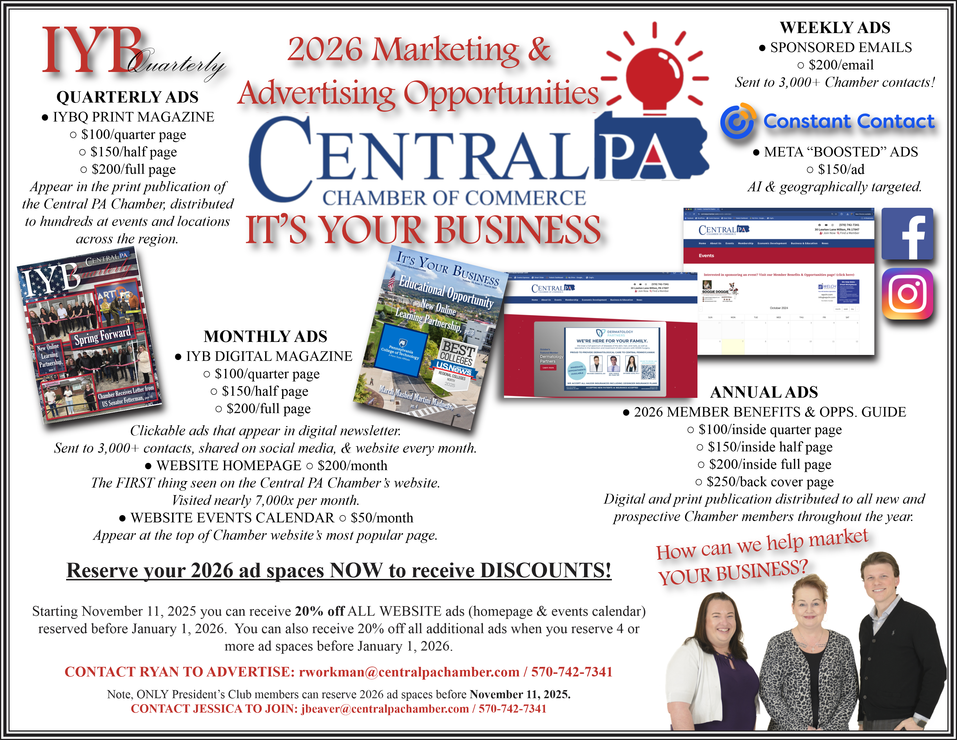 Central PA Chamber members have the opportunity to advertise in our popular print and digital publications as well as on our website (homepage & events calendar)! We offer advertising rates to fit practically any budget. Members may choose to advertise in It’s Your Business, IYB Quarterly or on the website at any point in the year, as availability allows. In addition, during the last quarter of the year, members may also commit to advertising in our annual publications, including the Member Benefits & Opportunities Guide as well as the Success Guide. All digital advertising is also “clickable”, linking your webpage of choice directly to the ad. And, finally, members of The President’s Club receive a 20% discount on advertising in It’s Your Business. Don’t have the ability to create an ad or have one made? We can help! Contact Ryan Workman (rworkman@centralpachamber.com) for more details!
