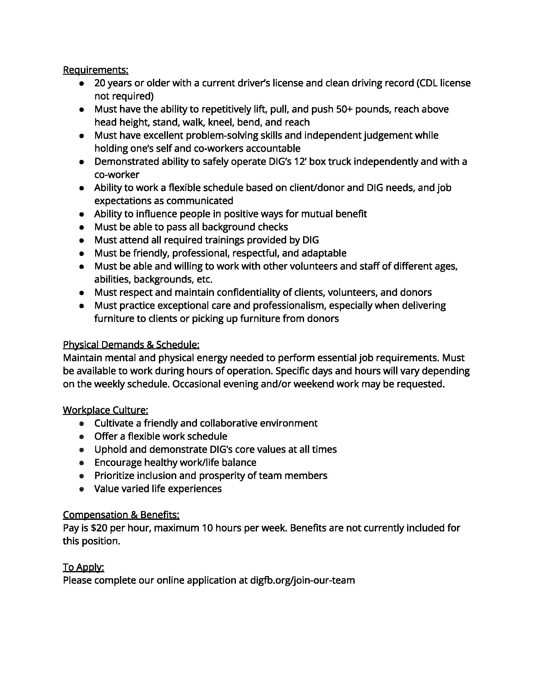 • Current driver’s license • High school diploma or equivalent preferred • Previous shop, warehouse, or labor experience is a plus • Basic knowledge of tools and equipment • Ability to follow instructions and work independently or as part of a team • Strong work ethic and reliabilityPhysical Requirements: