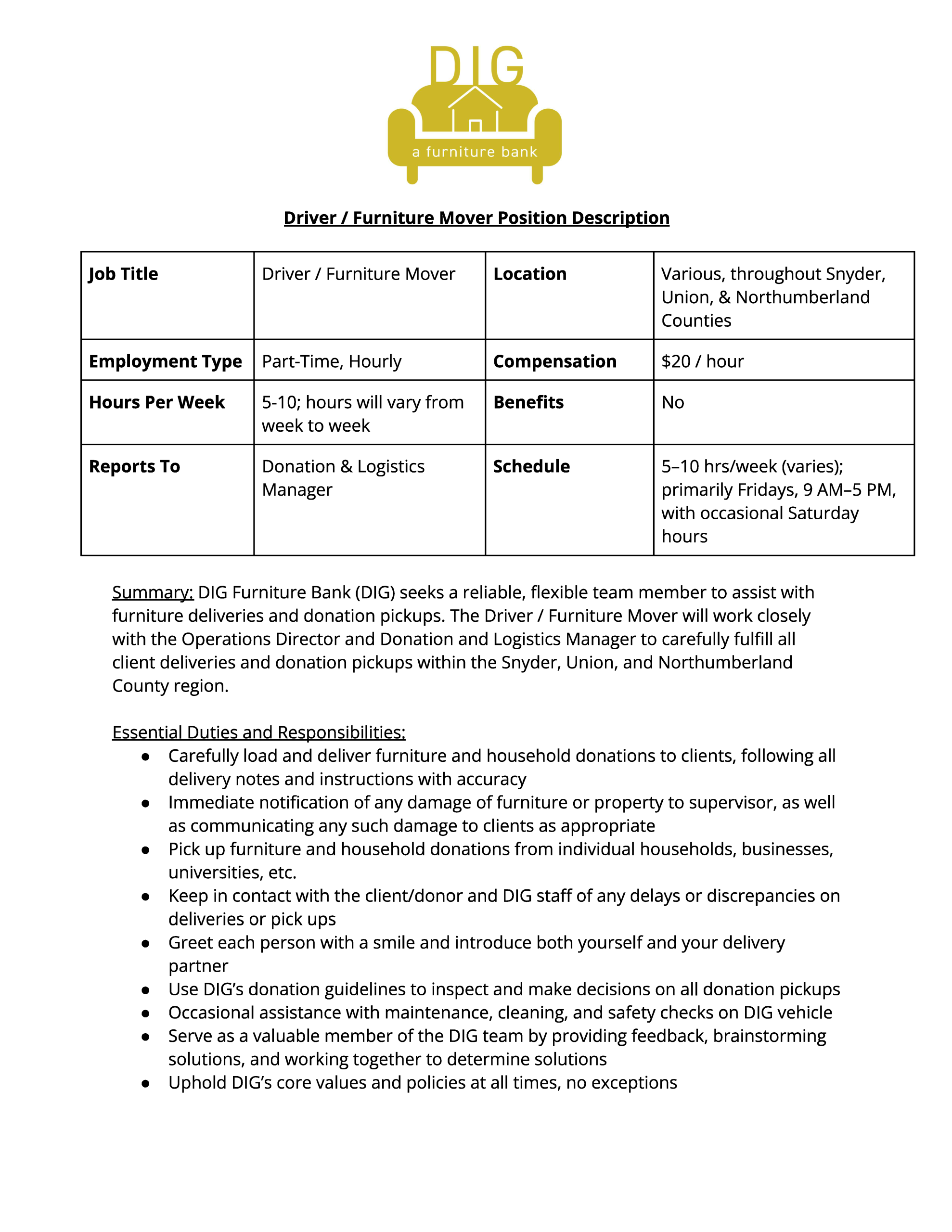There are no supervisory responsibilities for this position at this time.Essential Duties & Responsibilities: