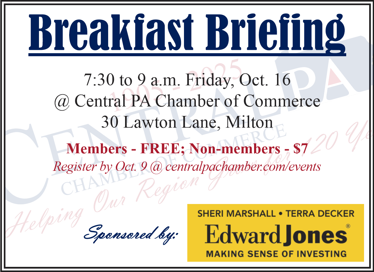 The Central PA Chamber offers a morning networking breakfast for Chamber members, their employees and for prospective members. Refresh your knowledge of Chamber activities and benefits and/or come and meet fellow members. Attendees have the opportunity to give a 28-second elevator pitch about their business/organization. The breakfasts are held from 7:30 to 9 a.m. at the Chamber office and are free to attend for Central PA Chamber members. There is a $7 fee for non-members. Each Breakfast Briefing begins with a breakfast buffet at 7:30 followed by a presentation at 8. The program ends promptly at 9. Seating is limited & registration is required.