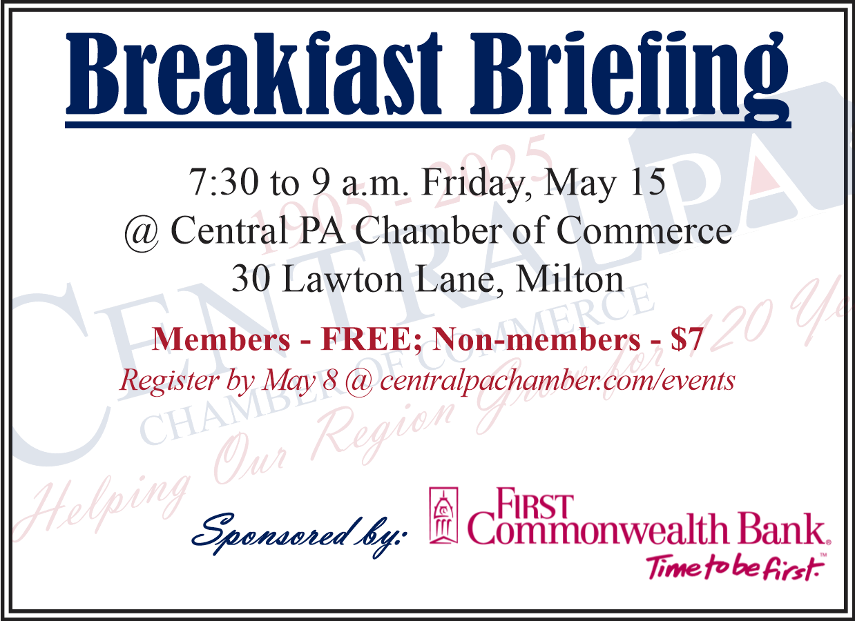 The Central PA Chamber offers a morning networking breakfast for Chamber members, their employees and for prospective members. Refresh your knowledge of Chamber activities and benefits and/or come and meet fellow members. Attendees have the opportunity to give a 28-second elevator pitch about their business/organization. The breakfasts are held from 7:30 to 9 a.m. at the Chamber office and are free to attend for Central PA Chamber members. There is a $7 fee for non-members. Each Breakfast Briefing begins with a breakfast buffet at 7:30 followed by a presentation at 8. The program ends promptly at 9. Seating is limited & registration is required.