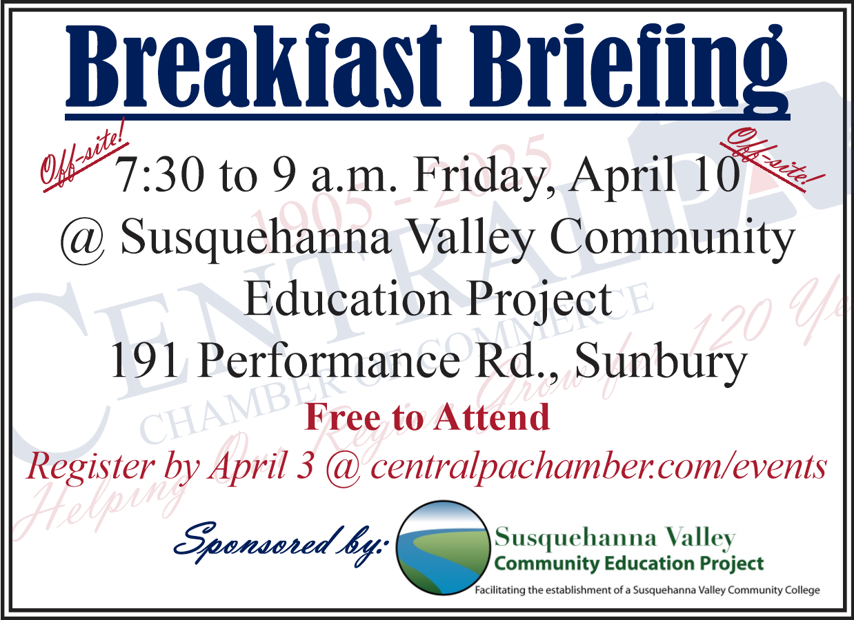 Note: This Breakfast Briefing is being held at the Susquehanna Valley Community Education Project. There is no cost to attend, but registration is still required.