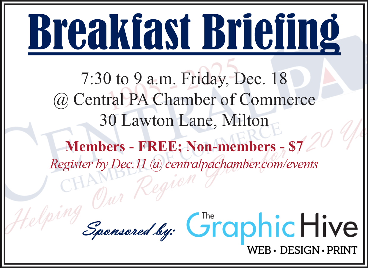 The Central PA Chamber offers a morning networking breakfast for Chamber members, their employees and for prospective members. Refresh your knowledge of Chamber activities and benefits and/or come and meet fellow members. Attendees have the opportunity to give a 28-second elevator pitch about their business/organization. The breakfasts are held from 7:30 to 9 a.m. at the Chamber office and are free to attend for Central PA Chamber members. There is a $7 fee for non-members. Each Breakfast Briefing begins with a breakfast buffet at 7:30 followed by a presentation at 8. The program ends promptly at 9. Seating is limited & registration is required.