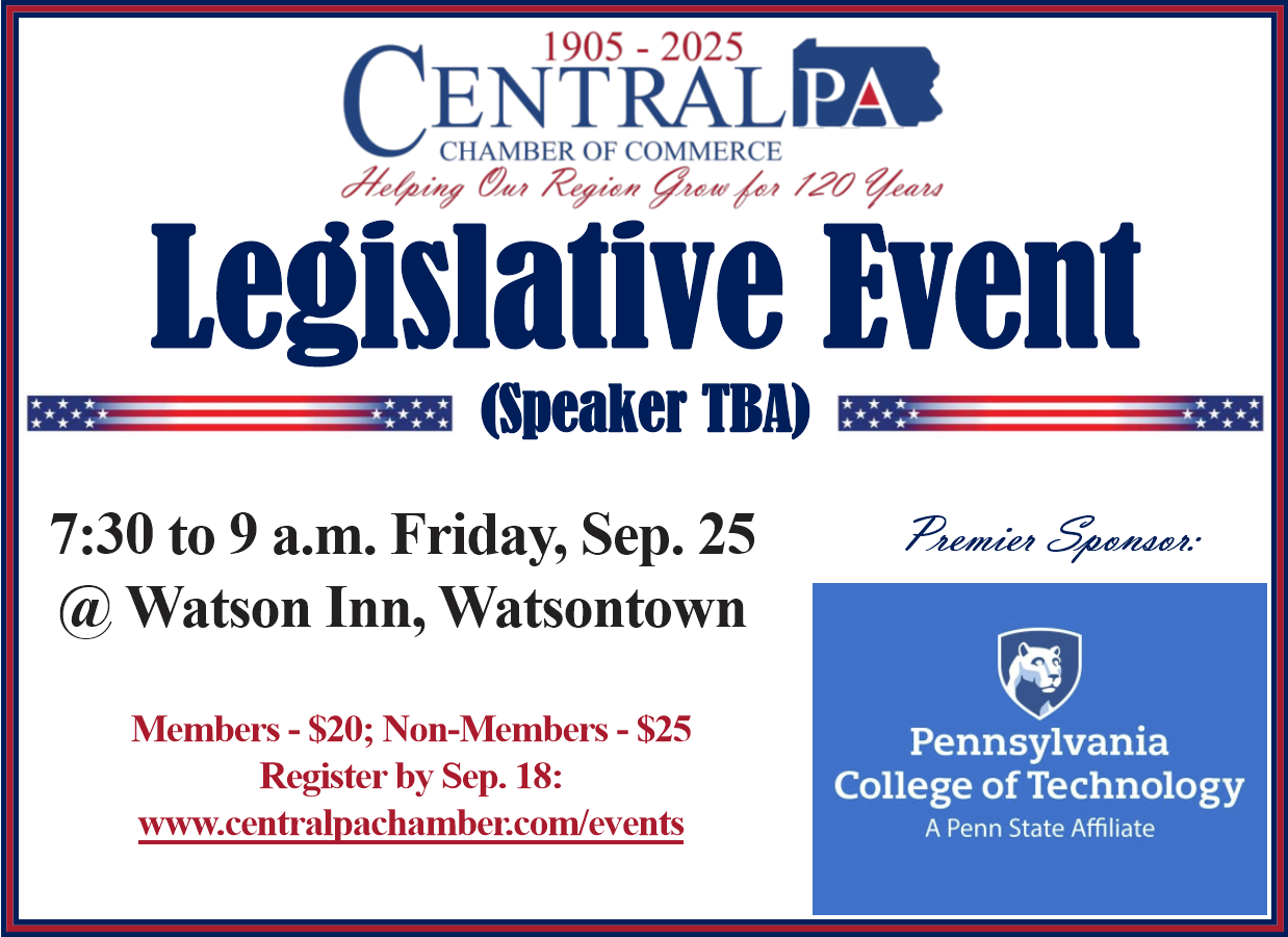 Legislative Events provide an opportunity for Central PA Chamber members and the general public to meet federal-, state- and county-elected officials, and to hear about issues affecting the community and specifically the business climate. The event begins with a breakfast buffet at 7:30 a.m., followed by the sponsor presentation and speaker at 8. The event ends at 9. There is a fee to attend, and registration is required.